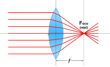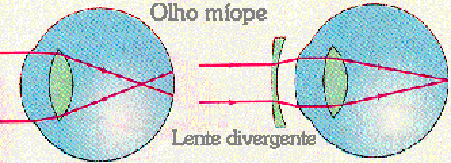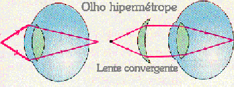 Observando a imagem ao lado, vemos uma lente convergente, que é capaz de desviar os raios luminosos paralelos para um comportamento convergente, isto é, em direção à um ponto focal único. É exatamente como uma lente convergente que uma estrutura do nosso olho chamada de cristalino age. A imagem será formada na retina, que fica no ponto de foco. Quando esse ponto de foco está antes da retina, dizemos que a pessoa é míope; quando está depois, hipermétrope. Vale lembrar que os músculos ciliares podem controlar a forma do cristalino, fazendo com que ele desvie mais ou menos a luz, possibilitando que enxerguemos melhor objetos mais longe ou mais perto. Quando você concentra seus olhos em um objeto próximo, suas lentes tornam-se quase esféricas, de forma involuntária. Quando você visualiza um objeto distante, suas lentes se achatam. Isso é um ajuste automático de foco, feito de forma involuntária pelos músculos ciliares.